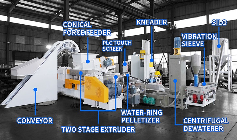 Pétrin + alimentation forcée conique + extrudeuse à vis unique + granulation de face de matrice de refroidissement par air.